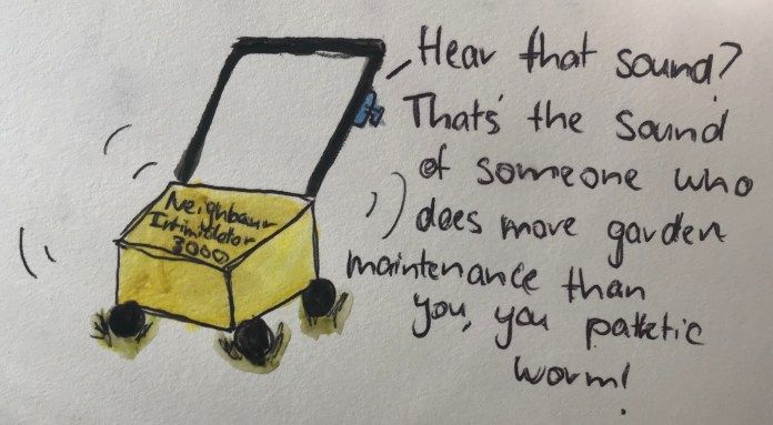 Of course, when there’s a sense of guilty pleasure there’s also the compulsion to hide what you’re doing. But mowing the lawn is very public; those machines aren’t quiet. The neighbours would definitely hear. And I knew what they’d be thinking: