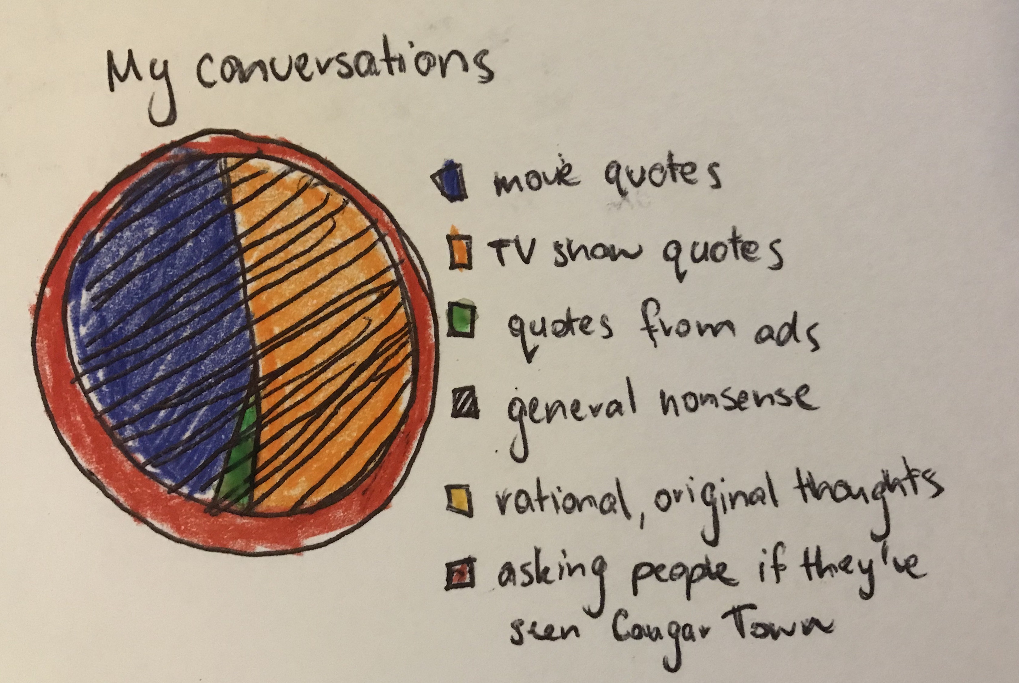Actually, we have a lot of sayings. Most of them (and by “most”, I mean 98.99 per cent) are quotes from the shows and movies we’ve seen 17,000 times over. It has got to the point that, whenever we chat on the phone, we have the same conversation about the ratio of pop culture quotes to original dialogue. About 20 minutes in, we wonder how many shows we’ve quoted. We then wonder if we could go five minutes without a quote and then, inevitably, we fail said challenge.