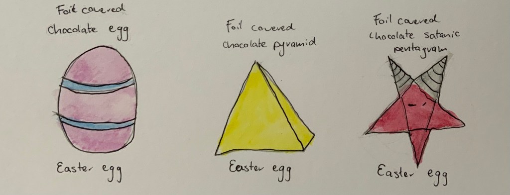Well, it’s not actually an egg – it’s shaped like a bunny. But the term “Easter egg” is kind of like a catch-all way to describe all foil-wrapped novelty-shaped chocolate confections that are produced to be distributed on the first Sunday after the Paschal full moon, juuuust after the spring equinox in the northern hemisphere (you can see that “Easter egg” gets to the point quicker).