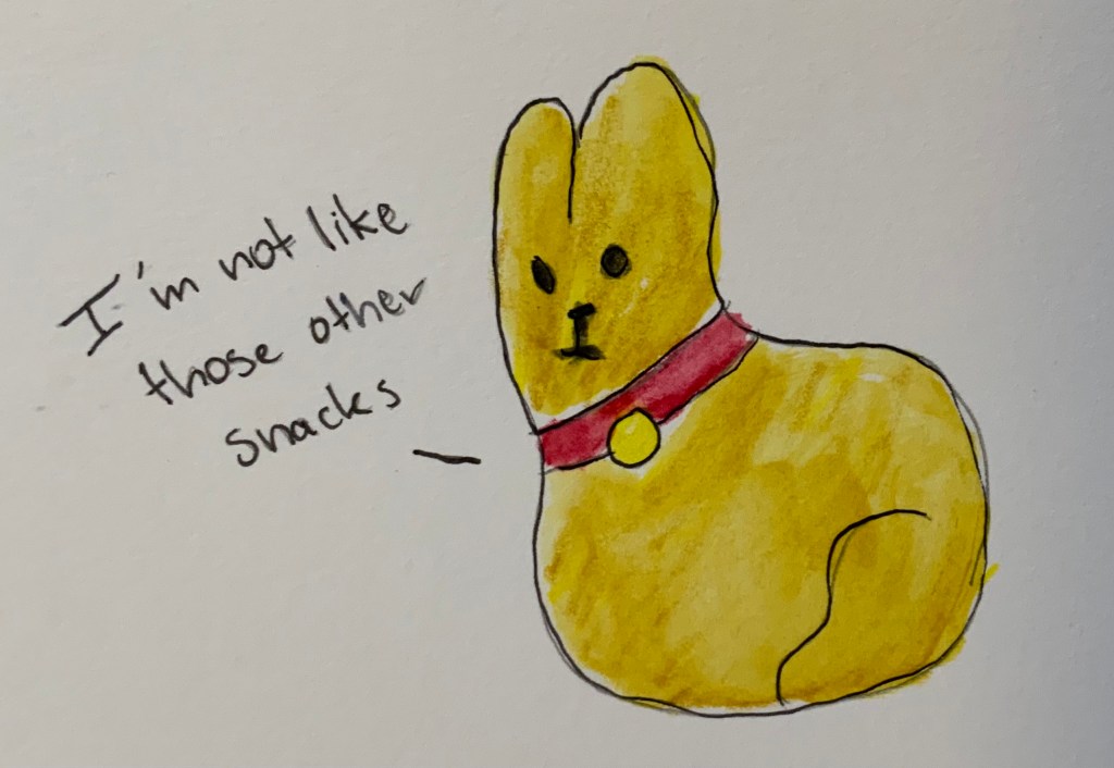 It’s one of the fancier kinds of Easter bunnies. I mean, it’s still one you can get at the supermarket, but it’s the fanciest one you can get at the supermarket. It’s good quality chocolate, so it’s the kind of Easter egg that isn’t all about the presentation, how ever fabulous it is. There’s substance underneath all the bells and golden foil. In short, it’s a good egg.